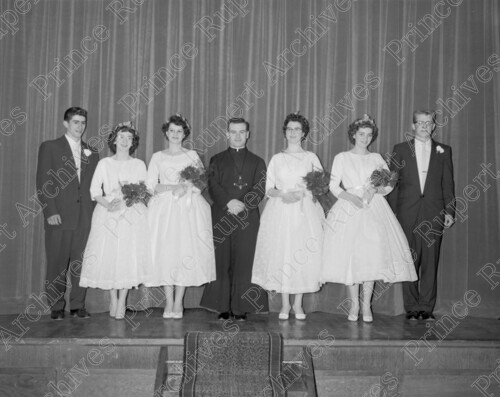Scope & Content: Item consists of the Annunciation School Graduation ceremony. This includes six students and a priest on a stage. Marie Toth can be seen standing third from the left. Handwritten annotation on verso of copy 2 reads: "1959." Handwritten annotation on verso of copy 3 reads: "Annunciation Graduation 1959."