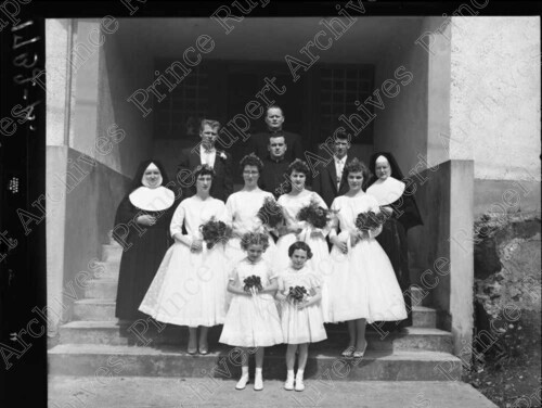 Scope & Content: Item consists of six Annunciation School Graduates, two younger students, two priests and two nuns on the front steps of the school. Pictured in the back row: Father J. B. Tracey, O.M.I., Father Michael Morrin, O.M.I., Barry Blyth and Bob Oskey. Pictured in the front two rows are Sister Marie Aubert, Henrietta Cormier, Anne Heustis, Marie Dvornack and Kathy Saunders. Handwritten annotation on recto of copy 2 reads: "Annunciation Graduation. 1959. Prince Rupert." Stamped annotation on verso of copy 2 reads: "Photo by Jack Wrathall Prince Rupert, B. C."
