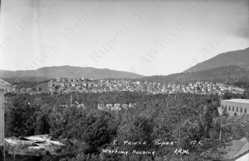 Scope & Content: Item depicts a view of WW2 wartime housing on Overlook Street. Handwritten annotation on recto of copy 1 reads: "E. Prince Rupert B. C. Wartime Housing J.R.W." Handwritten annotation on recto of copy 2 reads: "War Time Housing Built During the War. Taken 1947. ON Overlook." Stamped annotation on verso of copy 2 reads: "Photo by Jack Wrathall Prince Rupert, B. C."