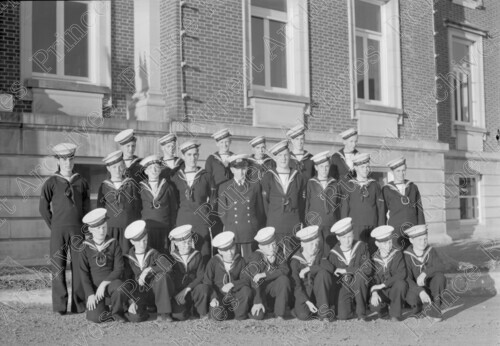 Scope & Content: Item consists of twenty-three Sea Cadets including their officer in front of the Prince Courthouse on Market Place. Handwritten annotation on recto of copy 2 reads: "Sea Cadets - Front of Court House." Stamped annotation on verso of copy 2 reads: "Photo by Jack Wrathall Prince Rupert, B. C."