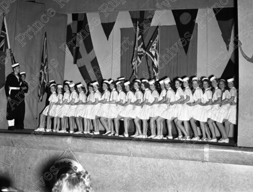 Scope & Content: Item consists of Job's Daughters dancing on the stage at the Prince Rupert Civic Centre on 2nd Avenue West and McBride Street. Two sea cadets can be seen standing on the side of the stage. One of the girls on stage is Mary Giske. Handwritten annotation on recto of copy 2 reads: "Jobs Daughters. Civic Centre. 2nd. Ave. & McBride St. Pr. Rupert, B.C. Mar. 29/48." Stamped annotation on verso of copy 2 reads: "Photo by Jack Wrathall Prince Rupert, B.C."