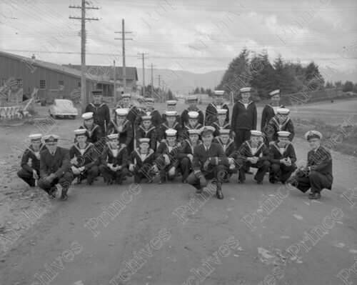 Scope & Content: Item consists of twenty-four sea cadets and three of their leaders on McBride Street and 1st Avenue. Handwritten annotation on recto of copy 2 reads: "Sea Cadets. 1st. Ave. & McBride St. June 21, 1952." Stamped annotation on verso of copy 2 reads: "Photo by Jack Wrathall Prince Rupert, B. C."