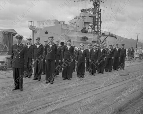 Scope & Content: Item consists of Royal Canadian Sea Cadets on a wharf, a ship can be seen behind them.