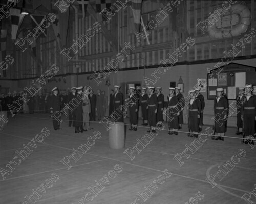 Scope & Content: Item consists of Sea Cadets in uniform lined up and being inspected by officers from HMCS Chatham. Handwritten annotation on recto of copy 2 reads: "H.M.C.S. Chatham. Capt. Cook. (Navy). Sept. 6. 1952 1st. Ave. & McBride. St." Stamped annotation on verso of copy 2 reads: "Photo by Jack Wrathall Prince Rupert, B. C."