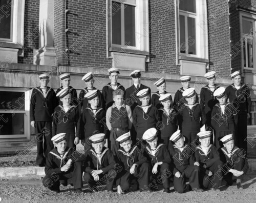 Scope & Content: Item consists of Twenty-three Sea Cadets including their officer standing in three rows in front of the Prince Rupert Courthouse on Market Place. Handwritten annotation on recto of copies 2 and 3 reads: "Sea Cadets. Pr. Rupert, B.C." Stamped annotation on verso of copies 2 and 3 reads: "Photo by Jack Wrathall Prince Rupert, B. C."