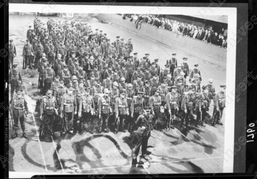 Scope & Content: Taken from above a large group of men stand at attention in rows
