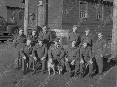 Scope & Content: Item consists of eleven men from the Canadian Army Medical Corps and a dog lined up in two rows at Roosevelt Park with two buildings in the background and a sign that reads "Headquarters 17th (N.B.C.) Coast Regiment R.C.A. C.A." Pictured in the back row farthest on the right is Sergeant Spiro Gurgavich. Handwritten annotation on recto of copy 3 reads: "No. 6. Back Row Sgt. Spiro Gurgavich. Medical Corp. 200 Blk. 6th Ave. W. Pr. Rupert. 1946." Stamped annotation on verso of copy 3 reads: "Photo by Jack Wrathall Prince Rupert, B. C."