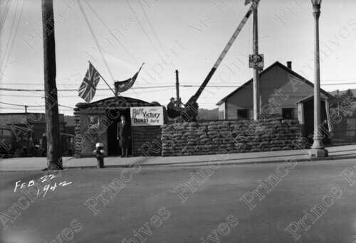 Scope & Content: Item consists of a person standing at the 400 block of 3rd Avenue West in a small structure next to a sign that reads "Buy Victory Bonds Here". Sand bags are piled up to the right of the structure during World War II. Handwritten annotation on recto of copy 2 reads: "Victory Bond Sale. 400 Blk. 3rd. Ave. W. Feb. 22 - 1942. Pr. Rupert, B.C." Stamped annotation on verso of copy 2 reads: "Photo by Jack Wrathall Prince Rupert, B. C."