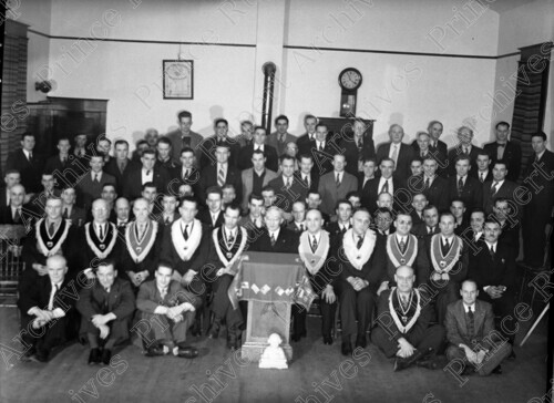 Scope & Content: Item consists of a large group of men in the Moose Lodge. Handwritten annotation on recto of copies 2 and 3 reads: "Members Moose Lodge. Pr. Rupert, B.C. 1945." Stamped annotation on verso of copies 2 and 3 reads: "Photo by Jack Wrathall Prince Rupert, B. C."