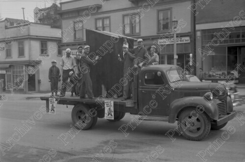 Scope & Content: Item consists of six men from the Prince Rupert Junior Chamber of Commerce and two children standing on the back of a flatbed truck. Signs posted on the truck read "Clean up, Paint up, beautify." Nelson's Barber and Permanent Wave shop is behind them. Harold Hampton and Tony Crawley can be seen on the truck.