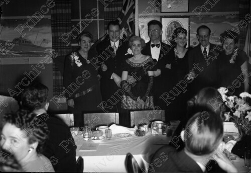 Scope & Content: Item consists of Members of the Gyro club with Mayor Arnold on the far left and Orme Stuart to the immediate right of Arnold. Pictured, from left from left to right, are: Nora Arnold, Orme Stuart, an unidentified woman, an unidentified man, Zona Stuart and Mr. and Mrs. Bridges. Handwritten annotation on recto of copy 2 reads: "Gyro Club. Pr. Rupert. Jan. 20 - 1949." Stamped annotation on verso of copy 2 reads: "Photo by Jack Wrathall Prince Rupert, B. C."