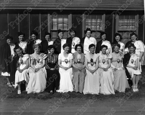 Scope & Content: Item consists of eighteen Ladies of the Moose Lodge sitting and standing in two rows. Some are wearing capes and hats. Handwritten annotation on recto of copy 2 reads: "Ladies of the Moose. Prince Rupert, B.C. 7th. St. May 7. 1951." Handwritten annotation on recto of copy 3 reads: "Ladies of the Moose Lodge. May 7 - 1951. Prince Rupert, B. C." Stamped annotation on verso of copies 2 and 3 reads: "Photo by Jack Wrathall Prince Rupert, B. C."