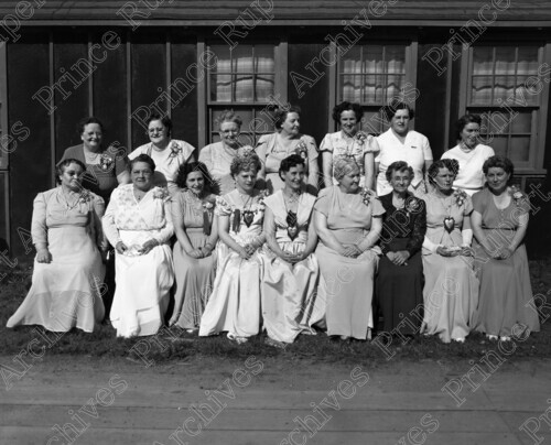Scope & Content: Item consists of sixteen women from the Moose Lodge in two rows posing for a photograph. They are all wearing flower corsages. One of the women pictured in the back row is Amy Casper. The woman pictured in the front row second from the left is Mabel Skinner. Handwritten annotation on recto of copy 2 reads; "Ladies of the Moose. Prince Rupert, B.C. 7th. St. May. 7. 1951." Stamped annotation on verso of copy 2 reads: "Photo by Jack Wrathall Prince Rupert, B. C."