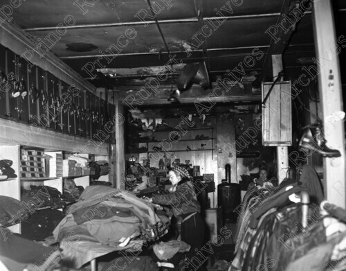 Scope & Content: Item consists of two women surrounded by clothing and other products inside of the fire damaged Men's & Boy's Clothing Store on the 600 block of 3rd Avenue West. Handwritten annotation on recto of copy 2 reads: "After Mens & Boys Clothing Store Fire. Mar -7 -1951. 600 Blk. 3rd. Ave." Stamped annotation on verso of copy 2 reads: "Photo by Jack Wrathall Prince Rupert, B. C."