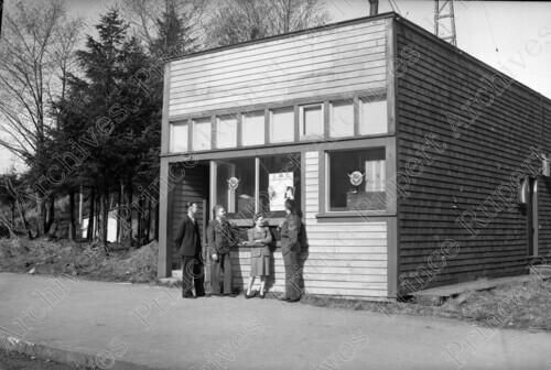 Scope & Content: Item consists of Clarence Insulander, two other men and one woman stand outside of the CFPR Radio station at 2nd Avenue West and 3rd Street with trees to the left. The man standing farthest on the right is a Canadian Army officer. Handwritten annotation on recto of copy 2 reads: "C.F.P.R. - C.B.C. Clarence Insulander. 1942." Stamped annotation on verso of copies 2 and 3 reads: "Photo by Jack Wrathall Prince Rupert, B.C."