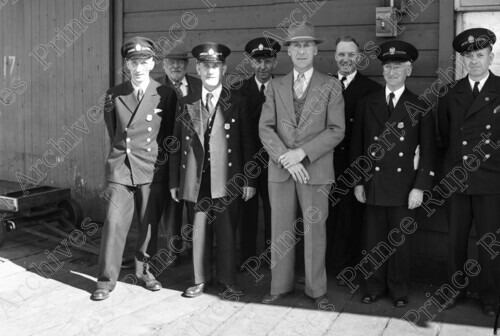 Scope & Content: Item consists of five men in customs uniforms standing with three men in civilian clothing one of whom is Mr. Goldbloom. Handwritten annotation on recto of copy 2 reads: "Prince Rupert. Custom Men & Mr. Goldbloom. May 21 - 1946." Stamped annotation on verso of copy 2 reads: "Photo by Jack Wrathall Prince Rupert, B. C."