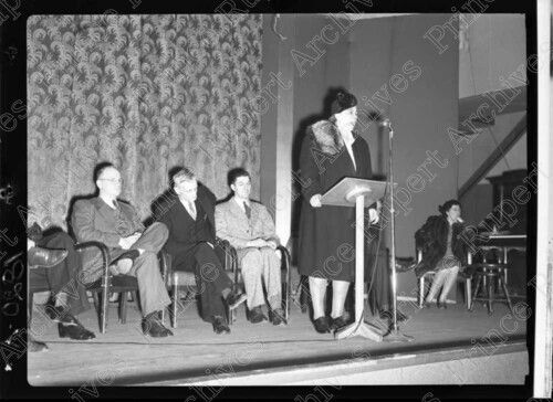 Scope & Content: Item consists of Nora Arnold speaking at a podium with a microphone while five men and a woman sit behind her. Pictured from left to right is: an unidentified and partially obscured man, T. Norton Young, H.M. Daggett, Tony Crawley, Nora Arnold, a partially obscured and unidentified man and Mrs. Black on the stage at the Civic Centre on Second Avenue West. Handwritten annotation on recto of copy 2 reads: "Election for Mayor. 1. Norton Young. 2. H.M. Daggett. 3. Tony Crawley. 4. Nora Arnold. Dec. 12, 1947 - Prince Rupert." Stamped annotation on verso of copy 2 reads: "Photo by Jack Wrathall Prince Rupert, B. C.'