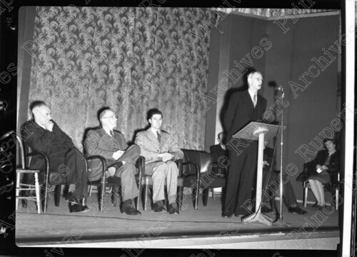 Scope & Content: Item consists of H.M. Daggett speaking at a podium into a microphone while five men and a woman sit in the background. Pictured from left to right is: Mr. Black, T. Norton Young, Tony Crawley, H.M. Daggett, two partially obscured men and Mrs. Black on stage at the Civic Centre on 2nd Avenue West. Handwritten annotation on recto of copy 2 reads: "Election for Mayor. 1. Black. 2. Norton Young. 3. Tony Crawley. 4. H.M. Daggett. Dec. 12 - 1947. Prince Rupert." Stamped annotation on verso of copy 2 reads: "Photo by Jack Wrathall Prince Rupert, B. C."