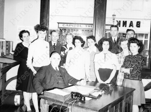 Scope & Content: Bank of Montreal staff, a man sits at a desk as group of men and women stand behind him. In the background the Capitol Theatre is visible. The man sitting at the desk is bank manager George R.S. Blackaby.