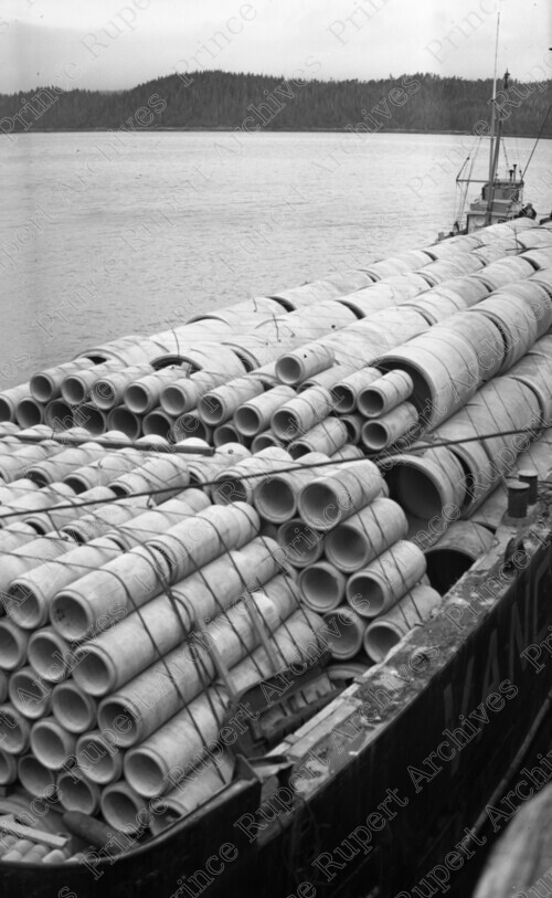 Title: Acme Steel & Bridge Co. Barge Loaded with New Sewer and Water Pipes at Prince Rupert, B.C. in 1949