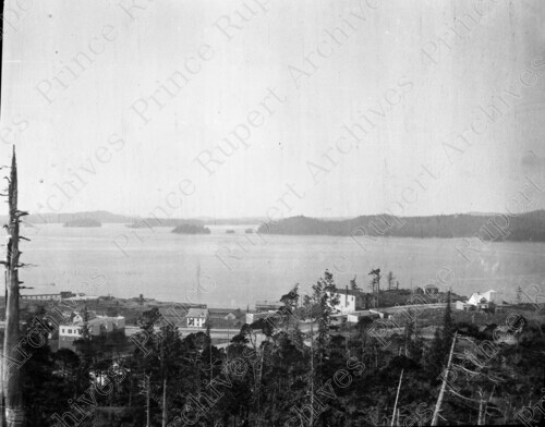 Scope & Content: Item consists of a a view looking down from Acropolis Hill on 1st and 2nd Avenue as well as Water Street with a view of the Prince Rupert Harbour in the background. The view includes Five Corners, the McMordie Apartments and the Besner Apartments. Handwritten annotation on recto of copy 2 reads: "5 corners. 2nd. Ave. W. Pr. Rupert. 1916. McMordie Apt. Besner Apt." Handwritten annotation on recto of copy 3 reads: "1st - 2nd. Ave. W. Pr. Rupert, B.C. 1916. McMordie Apts. Besner Apts." Stamped annotation on verso of copies 2 and 3 reads: "Photo by Jack Wrathall Prince Rupert, B. C."