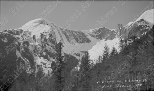 Scope & Content: Item consists of a scenic view of the snowy mountains and trees west of Terrace taken from highway 16. Handwritten annotation on recto of copies 1, 2 and 3 reads: "A scene on Highway 16 near Terrace B.C." Handwritten annotation on recto of copy 3 reads: "West of Terrace. Off Highway 16. 1947." Stamped annotation on verso of copies 2 and 3 reads: "Photo by Jack Wrathall Prince Rupert, B. C."