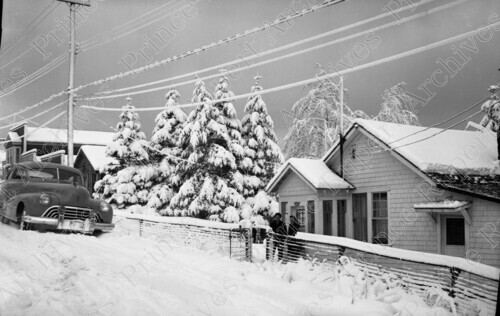 Scope & Content: Item consists of Ronnie and Polly Roberts standing outside of their home in the winter on Comox Avenue at the corner of Fulton Street and 9th Avenue West. Other residences and trees can be seen in the background. Handwritten annotation on recto of copy 2 reads: "Polly & Ron. Roberts Res. End of 8th. Ave. W. 1948." Stamped annotation on verso of copy 2 reads: "Photo by Jack Wrathall Prince Rupert, B. C."