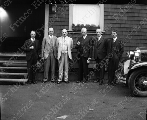 Scope & Content: Item consists of six men standing outside of the Biological Station located at the foot of McBride Street. The front of a car can be seen on the right. Handwritten annotation on recto of copy 2 reads: "Biological Station. Foot of McBride St. Prince Rupert. 1932." Handwritten annotation on recto of copy 3 reads: "1932. Norwegian Delagate [sic] Visiting Biological Station." Stamped annotation on verso of copies 2 and 3 reads: "Photo by Jack Wrathall Prince Rupert, B. C."