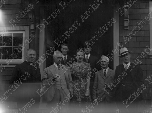 Scope & Content: Item consists of six men and a woman stand outside of the Biological Station located at the foot of McBride Street. Those pictured include a Dr. Carter and Ruth Gillies. Handwritten annotation on recto of copies 2 and 3 reads: "Biological Station. Foot of McBride St. Pr. Rupert. 1932." Handwritten annotation on recto of copy 4 reads: "McBride St. at Biological Station. Dr. Carter. Ruth Gillies." Stamped annotation on verso of copies 2, 3 and 4 reads: "Photo by Jack Wrathall Prince Rupert, B. C."
