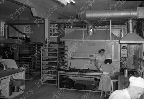 Scope & Content: Item consists of two women in uniform working at the Co-Op Bakery located at the 100 Block of 3rd Avenue West. Bakery equipment can be seen in the background. Handwritten annotation on recto of copy 2 reads: "Co-op Bakery. 100 Blk. 3rd. Ave. W. Pr. Rupert. 1955." Stamped annotation on verso of copy 2 reads: "Photo by Jack Wrathall Prince Rupert, B. C."