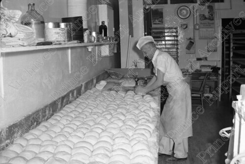 Scope & Content: Item consists of a man in uniform working inside of the Co-Op Bakery on the 100 block of 3rd Avenue West making bread. Handwritten annotation on recto of copy 2 reads: "Co-Op Bakery. 100 Blk. 3rd. Ave. W. Pr. Rupert. 1955." Stamped annotation on verso of copy 2 reads: "Photo by Jack Wrathall Prince Rupert, B. C."