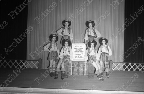 Scope & Content: Item consists of six women dressed as pirates stand on the stage around a chest and sign that reads "This is the Navy League Mystery Treasure Chest Contains ? and $15,000" at the Capitol Theatre at 3rd Ave W. Handwritten annotation on recto of copy 2 reads: "In Capitol Theatre. Prince Rupert, B.C. 1951." Stamped annotation on verso of copy 2 reads: "Photo by Jack Wrathall Prince Rupert, B. C."