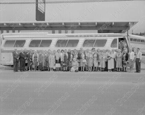Scope & Content: Item consists of a large group of retired male and female tourists from Portland, Oregon standing in front of a Trailway Bus parked on 7th Street in downtown Prince Rupert. Handwritten annotation on recto of copy 2 reads: "Retired Group From Portland - Oregan [sic]. Visiting Pr. Rupert. 7th. St. 1965."