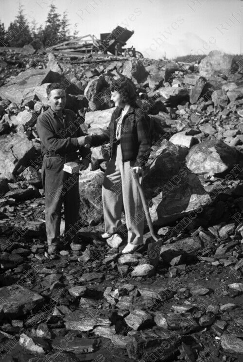 Scope & Content: Item consists of a man and a woman shaking hands while standing on a pile of rocks the woman is holding a shovel and the man a small box. The man and woman were looking for gold. Handwritten annotation on recto of copy 2 reads: "Gold Rush Park Ave. Pr. Rupert. Sept. 19 - 1947." Stamped annotation on verso of copy 2 reads: "Photo by Jack Wrathall Prince Rupert, B. C."