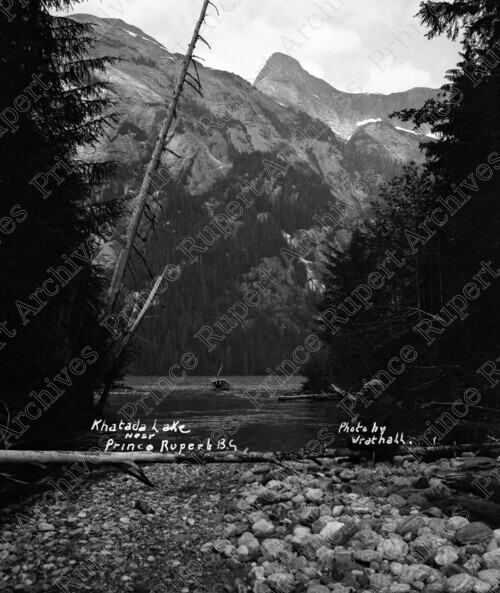 Scope & Content: Item consists of Khtada Lake and surrounding scenery showing mountains and trees in the distance. Handwritten annotation on recto of copies 1 and 2 reads: "Khatada [sic] Lake near Prince Rupert B.C. Photo by Wrathall." Handwritten annotation on recto of copy 2 reads: "1936." Stamped annotation on verso of copy 2 reads: "Photo by Jack Wrathall Prince Rupert, B. C."