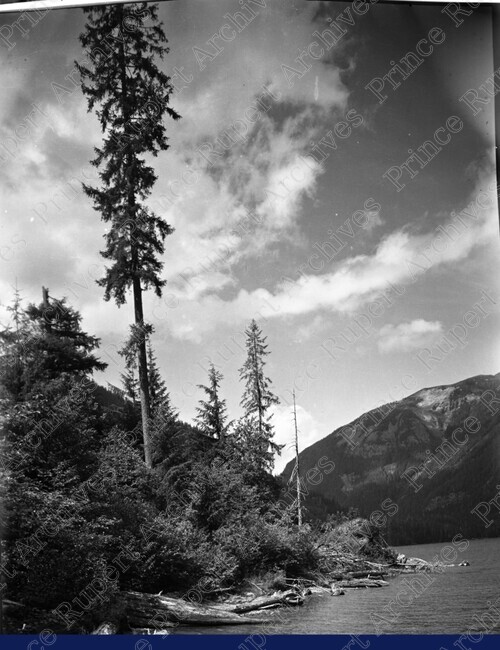 Scope & Content: Item consists of a view of Khtada Lake and surrounding scenery showing mountains, bushes and trees in the distance. Handwritten annotation on recto of copy 2 reads: "Khatada Lake - 1936." Stamped annotation on verso of copy 2 reads: "Photo by Jack Wrathall Prince Rupert, B. C."