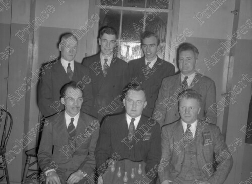 Scope & Content: Item consists of seven male members of the C.N.R. five pin bowling team. Handwritten annotation on recto of copy 2 reads: "C.N.R. Five Pin Bowling Team. 1945. Pr. Rupert." Stamped annotation on verso of copy 2 reads: "Photo by Jack Wrathall Prince Rupert, B. C."