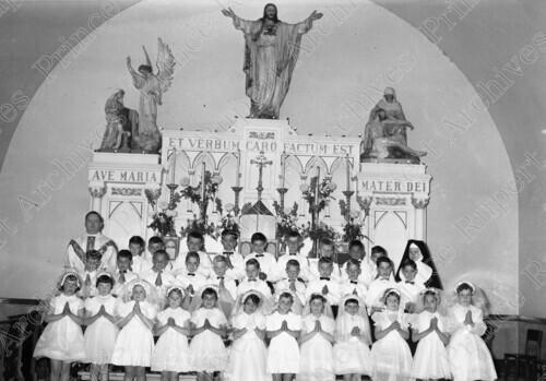 Scope & Content: Item consists of father Jim Tracy and nun along with a large group of boys and girls at their first communion showing the inside of Annunciation Catholic Church. Handwritten annotation on recto of copy 2 reads: "First Communion - Catholic Church. Pr. Rupert, B.C. May 29 - 1961." Stamped annotation on verso of copy 2 reads: "Photo by Jack Wrathall Prince Rupert, B. C."