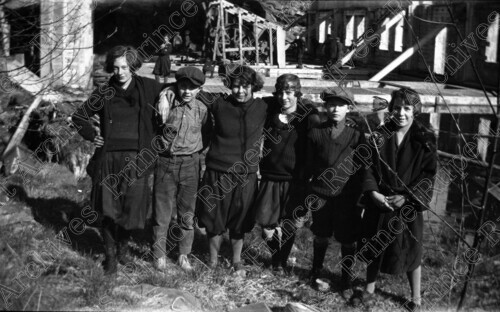 Scope & Content: Item consists of six school children from Borden Street School standing in a row. From left to right is: Hester Black, George Bell, May Thompson, Nellie Gurvich, Eddie Smith and Verna Brochu. Handwritten annotation on recto of copy 3 reads: "School Class - Hike to Port Edward. 1924. 1. Hester Black. 2. Geo. Bell. 3. May Thompson. 4. Nellie Gurvich. 5. Eddie Smith. 6. Verna Brochu." Stamped annotation on verso of copy 3 reads: "Photo by Jack Wrathall Prince Rupert, B. C."