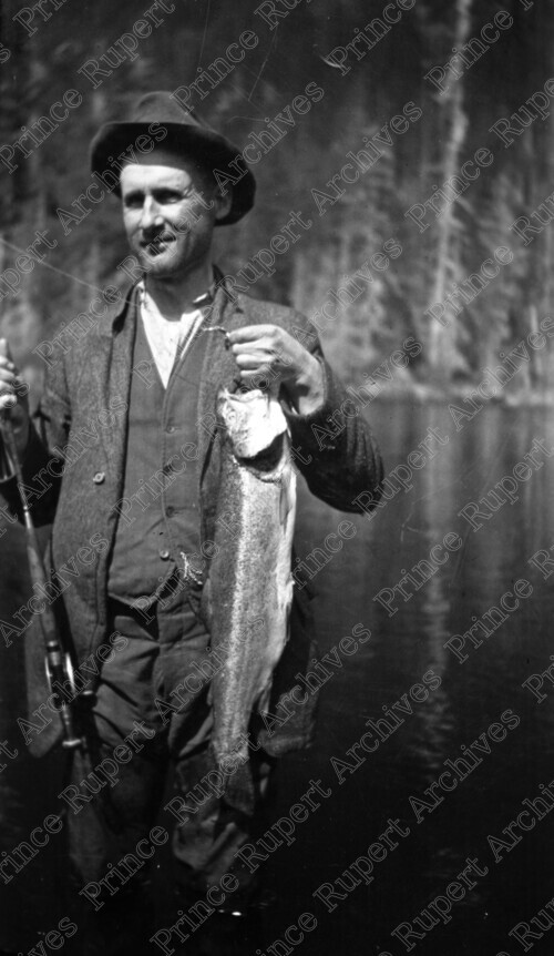 Scope & Content: Item consists of a man holding up a trout and fishing rod at Khtada Lake. Handwritten annotation on recto of copy 2 reads: "Khatada [sic] Lake. 1933." Stamped annotation on verso of copy 2 reads: "Photo by Jack Wrathall Prince Rupert, B. C."