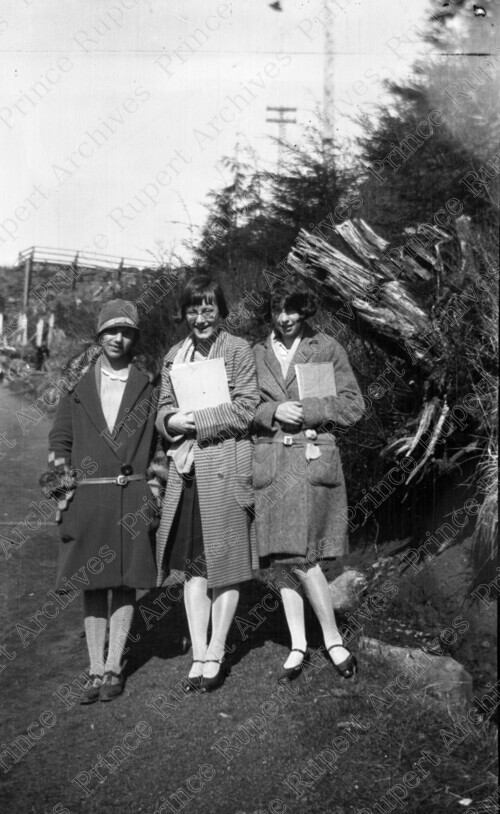 Scope & Content: Item consists of three young women standing together in a row at an unknown location with trees in the background. Pictured from left to right is: Marie Mussallem, Dot Ross and Rita McLean. Handwritten annotation on recto of copy 2 reads: "Marie Mussallem - Dot Ross - Rita McLean. 1932." Stamped annotation on verso of copy 2 reads: "Photo by Jack Wrathall Prince Rupert, B. C."