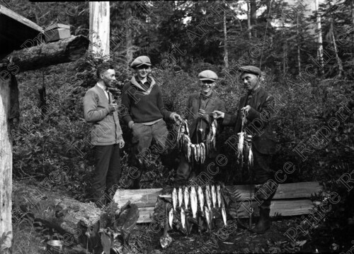Scope & Content: Item consists of George Wilkinson, Jack Wrathall, Bob Ross and Harold Ross at Khtada Lake holding up a large amount of trout. Handwritten annotation on recto of copy 2 reads: "Geo. Wilkinson - Jack Wrathall - Bob Ross - Harold Ross. Khatada [sic] Lake - 1928." Stamped annotation on verso of copy 2 reads: "Photo by Jack Wrathall Prince Rupert, B. C."