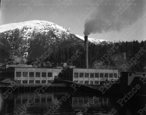 Scope & Content: Item consists of a view of an industrial building in Ocean Falls, B.C. taken from the water, showing trees and mountains in the background. Stamped annotation on verso of copy 2 reads: "Photo by Jack Wrathall Prince Rupert, B. C. Ocean Falls."