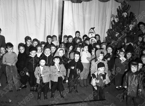 Scope & Content: Item consists of a a group of male and female students at a Conrad Street School Christmas concert. A man man in costume and Christmas tree can be seen in the back on the right. Handwritten annotation on recto of copy 2 reads: "Conrad St. School. 1947. Prince Rupert." Stamped annotation on verso of copy 2 reads: "Photo by Jack Wrathall Prince Rupert, B. C."