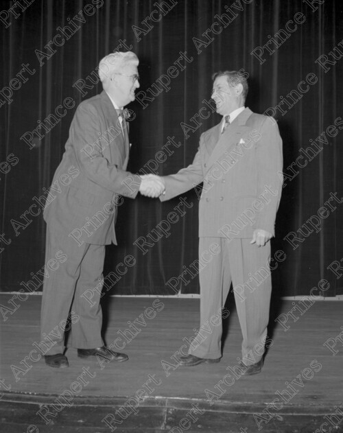Scope & Content: Item consists of Phil Linzey on the left shaking hands with Louis Amadio on the right as part of an awards presentation at the Capitol Theatre. Handwritten annotation on recto of copy 3 reads: "Capitol Theatre. Louis Amadio. Phil. Linzey. Presentation Award. Oct. 1953." Stamped annotation on verso of copies 2 and 3 reads: "Photo by Jack Wrathall Prince Rupert, B. C."