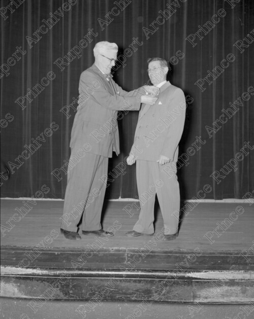 Scope & Content: Item consists of Phil Linzey on the left, pinning something to the lapel of Louis Amadio on the right as part of an awards presentation at the Capitol Theatre.