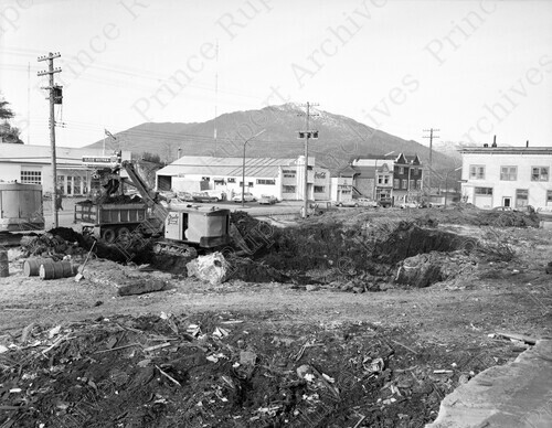 Scope & Content: Item consists of the 400 block of 2nd Avenue West showing the foundation for the new Federal building. Johnny McLeod's North Star Bottling Co. and the old Federal building can be seen in the background. The federal building would also house the post office. Handwritten annotation on recto of copy 2 reads: “Excafating [sic] for new Post office. 1962.” Handwritten annotation on recto of copy 3 reads: “400 - Blk. 2nd. Ave. W., Johnny McLeod’s North Star Bottling Ltd. Foundation for for [sic] New Federal Bldg. Pr. Rupert. 1962.” Stamped annotation on verso of copy 2 and 3 reads: “Photo by Jack Wrathall Prince Rupert, B. C.”
