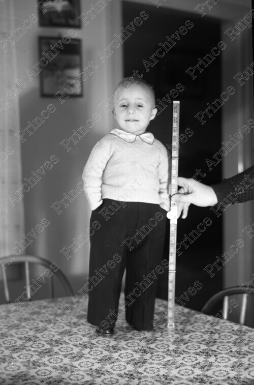 Scope & Content: Item consists of Dickie Sorenson, a little person, stands on a table as a child. His height is being measured by a hand that appears in the photo holding a ruler. Handwritten annotation on recto of copy 2 reads: "Dick Sorenson. Pr. Rupert. 1944. Midget."