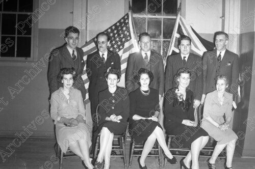 Scope & Content: Item consists of five women sitting in chairs and five men standing behind them with an American and British flag in the background at a Gyro Staff House at an unknown location. Mr. and Mrs. Joe Scott and Mr. and Mrs. Bill and Caroline Lambie appear in the photograph. Handwritten annotation on recto of copy 2 reads: "Gyros. Staff House. 1947."