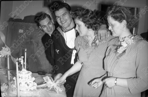 Scope & Content: Item consists of Mr. and Mrs. Thelma Doiron cutting their wedding cake as a man and woman look on, on their wedding day. Handwritten annotation on recto of copy 2 reads: "1944." Stamped annotation on verso of copy 2 reads: "Photo by Jack Wrathall Prince Rupert, B. C."
